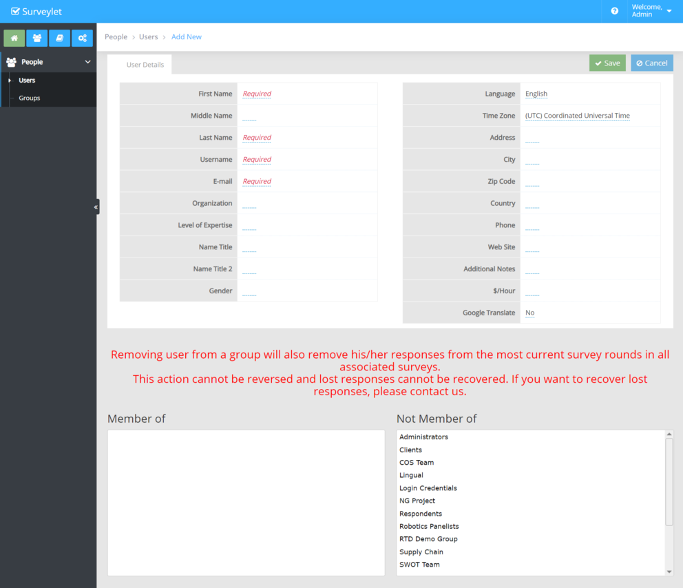 To manually add a new user, click on the "Add New User" menu. It will take you to the page shown below. Here you specify User Details and can add the user to one or more Groups.
