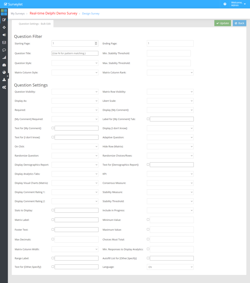 More often than not, you will run into situations where you would need to adjust the same settings at once for several questions spread out across multiple pages in your surveys and it would take time to do them one by one. The Bulk-Edit Question page was designed with this in mind saving you hours and hours of survey programming along the way. Here you can select the options you want to change and the questions you want to apply it to and then apply your changes with a click of a button.