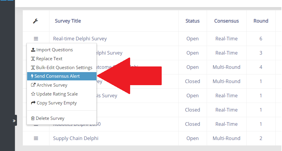 You can send out email alerts to your panelists manually from the main Survey List page. To send out emails, the "Consensus Change Alert" needs to be selected from the main Survey List page.