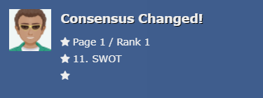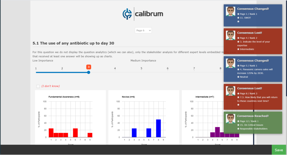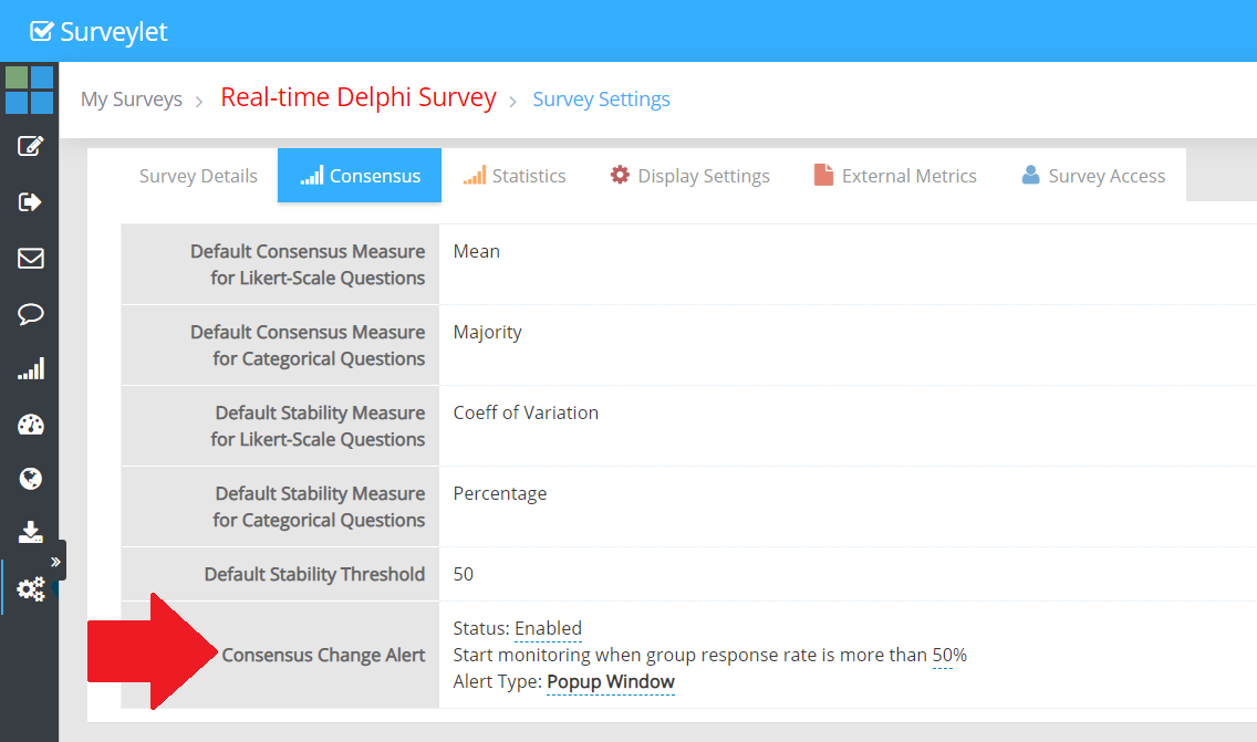You can also enable live consensus change alerts which are displayed to panelists in Real-time Delphi Surveys on the right side of their browser as popup windows. For it to work the Consensus Change Alert setting needs to be enabled (Survey Settings > Consensus > Consensus Change Alert). You need to specify when the change alert monitoring takes place (after a certain percentage of respondents have answered: