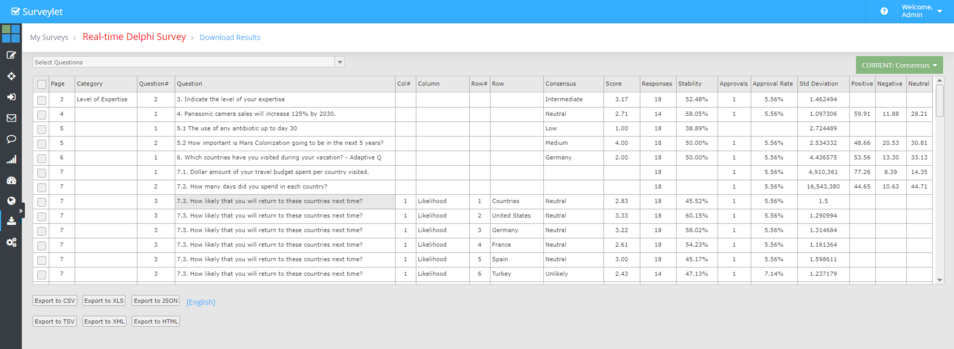 The 'CURRENT: Consensus' report displays consensus-related information. By default all questions are displayed, but you can click on the Question Selector dropdown to pick the questions you want to analyze.