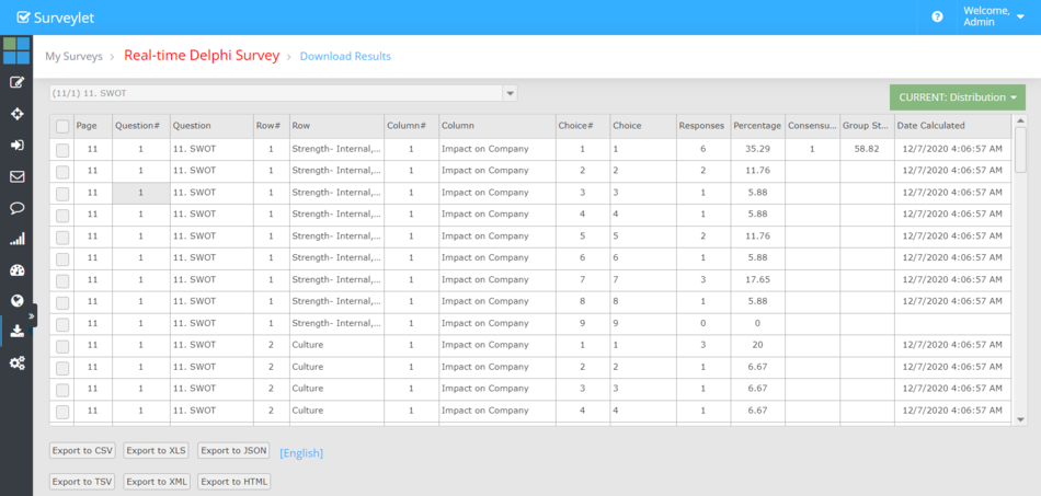 The distribution reports provides numeric and percentage analysis for user choice selections for quantitative questions.
