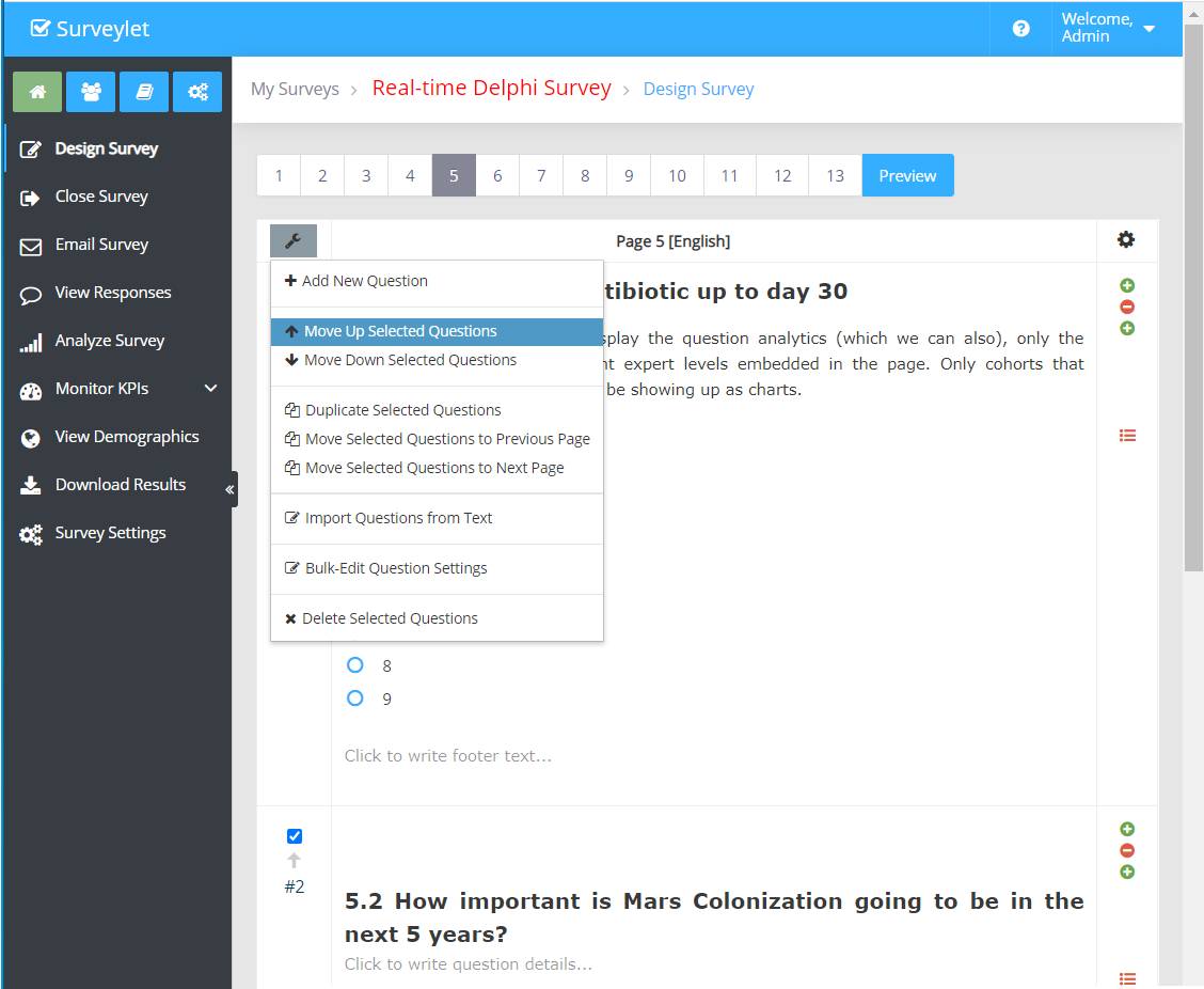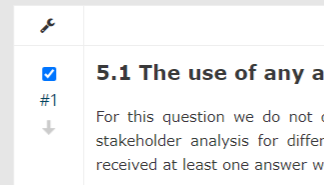 Occasionally you may want to run some operations on more than one questions at the same time, such as moving them up or deleting them. By clicking on the wrench icon, you will see a dropdown menu list with several options.