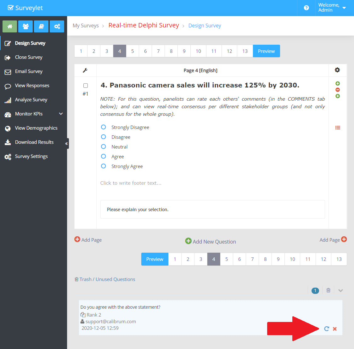 Deletes selected questions. This is a soft-delete operation, meaning that your deleted questions will be placed in the page's trash folder and can be recovered at any time. Soft-deleting a question does not yet remove any user responses associated with that question, it only hides the question from your survey and survey analysis pages.