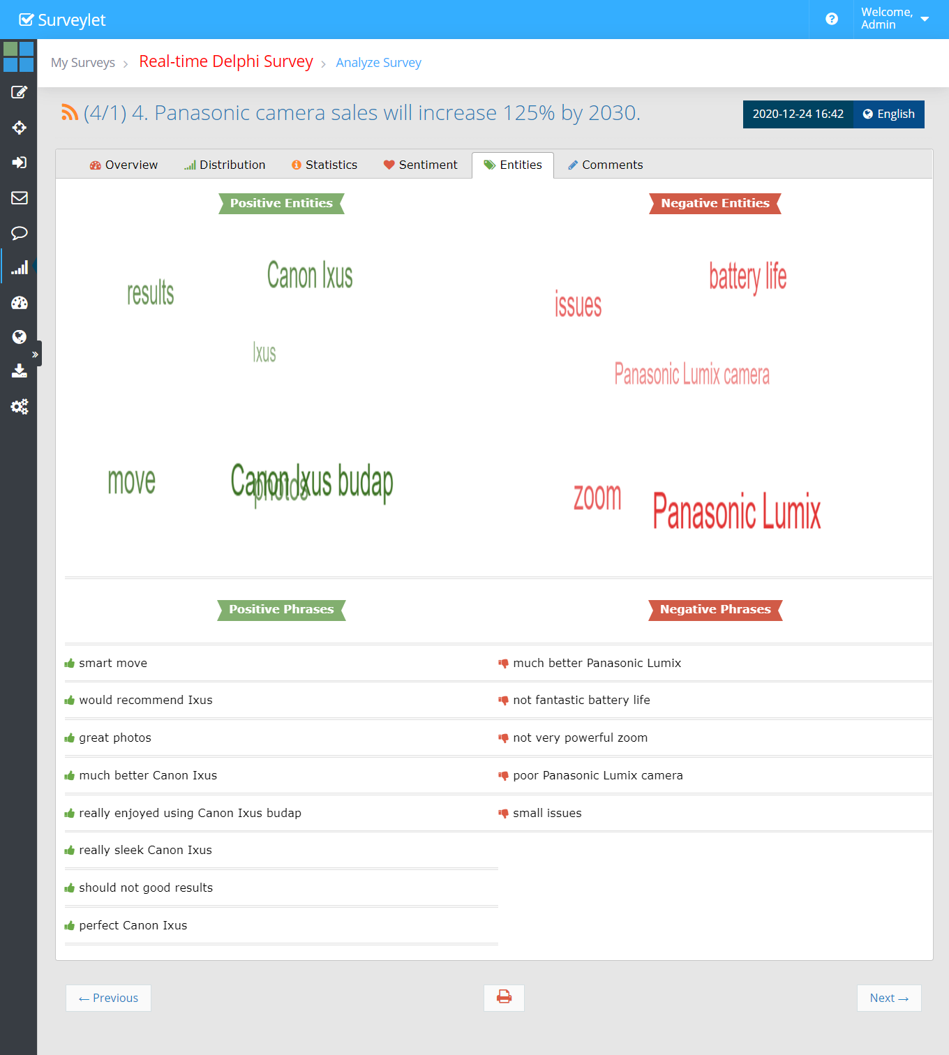 Surveylet's Natural Language Processing (NLP) engine carries out entity and phrase-level extraction and the results are displayed on the Entities tab.