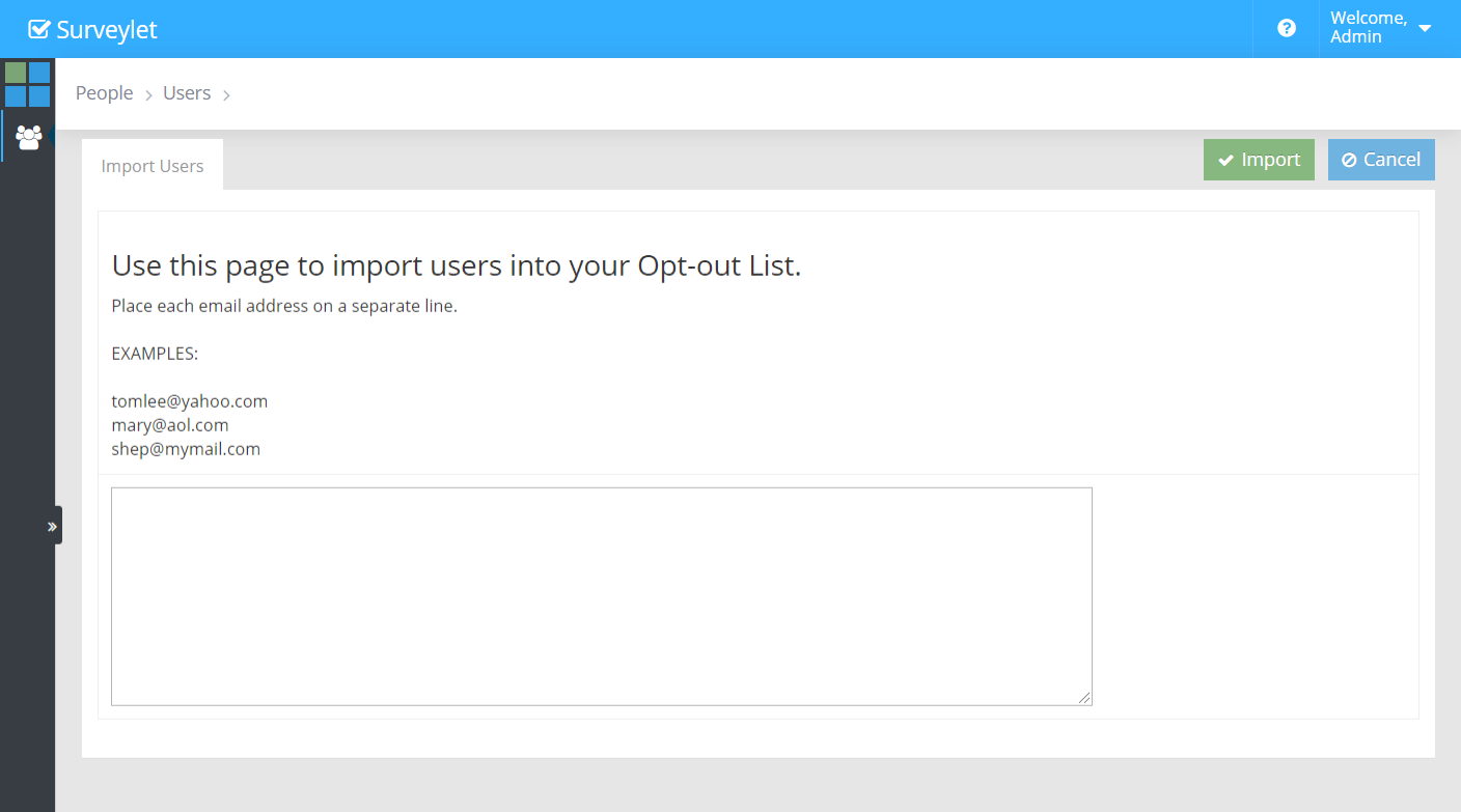 To add user into your Opt-out List, use this page to quick-import users by their email address. Each email must appear on its own line. Invalid emails or empty lines will be ignored and skipped. Adding users to the Opt-out list will remove their existing responses from all your surveys, which action cannot be restored.