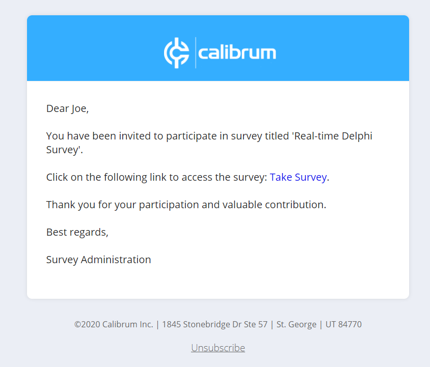 Calibrum do not send out unsolicited emails and you may opt out from receiving emails by clicking on the "Unsubscribe" link at the bottom of your Calibrum emails sent by Surveylet (shown below) and send us an email to request removal. We will remove your email address from the survey participants list and delete all your existing responses and collected data for you. This cannot be reversed, so please carefully review if you want to opt out from the survey.