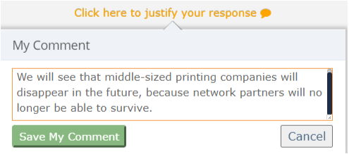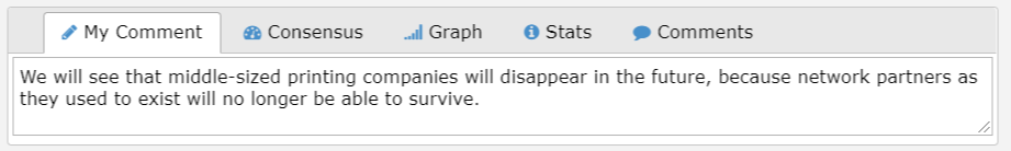 For questions where commenting (the "My Comment" tab) is enabled by the survey administrator, you may (or are required to) enter your reasoning behind your answer you gave for the question. There is no limit to the length of your open end input, fee free to type as much as you wish.