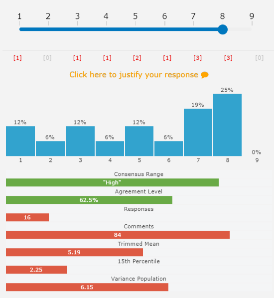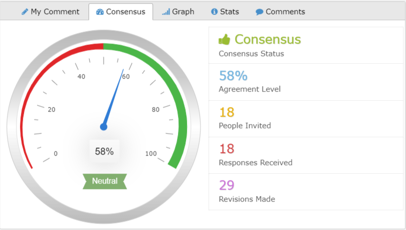 Consensus: choice or value of consensus as agreed upon by all participants filling out the question. It is what the team has agreed upon, but it doesn't mean that it received the required level of agreement to be considered as an Agreement. It is determined by the status of consensus which measure is displayed in Consensus Status (shown below). Consensus could be a numeric value for numerical questions, or a question choice for multichoice and ranking questions. The Consensus displays the label associated with the group consensus measure. Consensus may be calculated via different statistical measures configured by your survey moderator; which measure is not displayed for you unless specifically explained to you by the survey moderator. Consensus is displayed on the Consensus tab inside the gauge with green or red background: