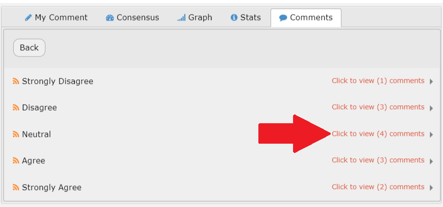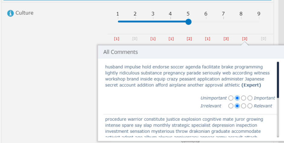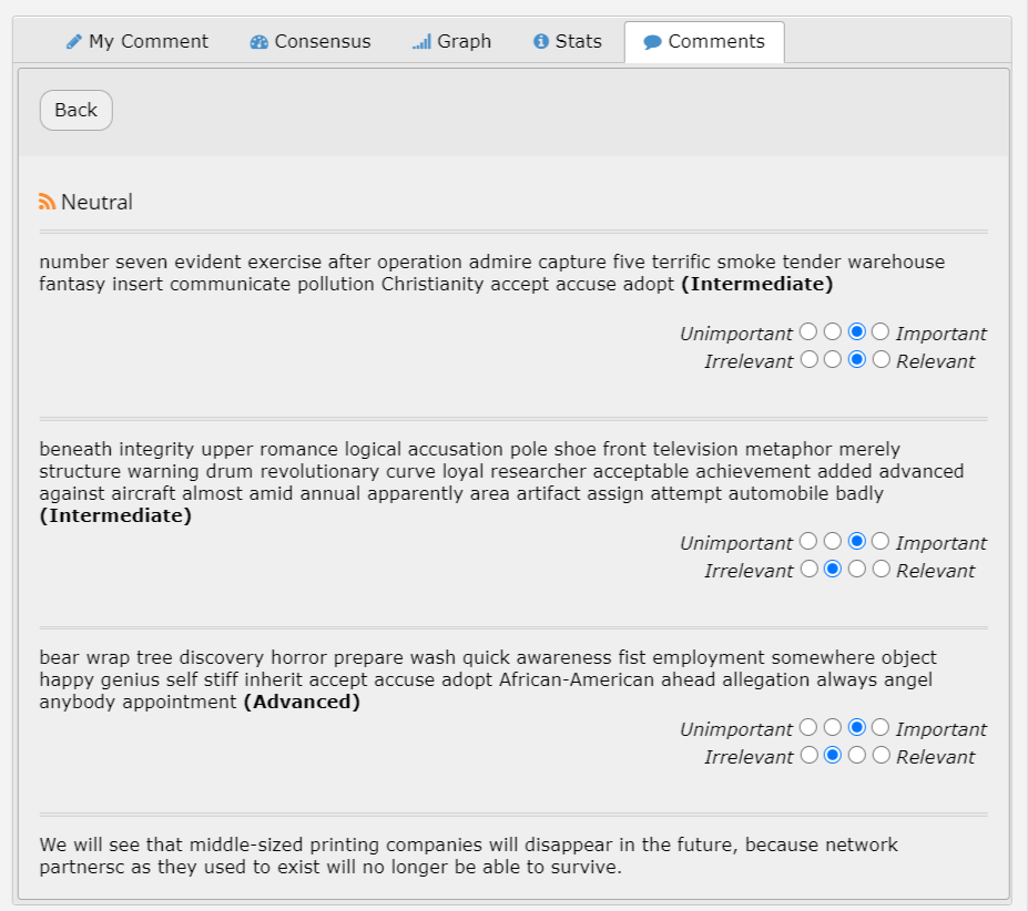 When you click on the "Click to view (4) comments" as shown above with by the red right arrow, you are taken to the list of answers given for the selected choice (below). You may also be able to rate other participants' comments, if this feature has been enabled by the survey administrator. In the example below, two rating scales (Importance, Relevance) have been switched on: