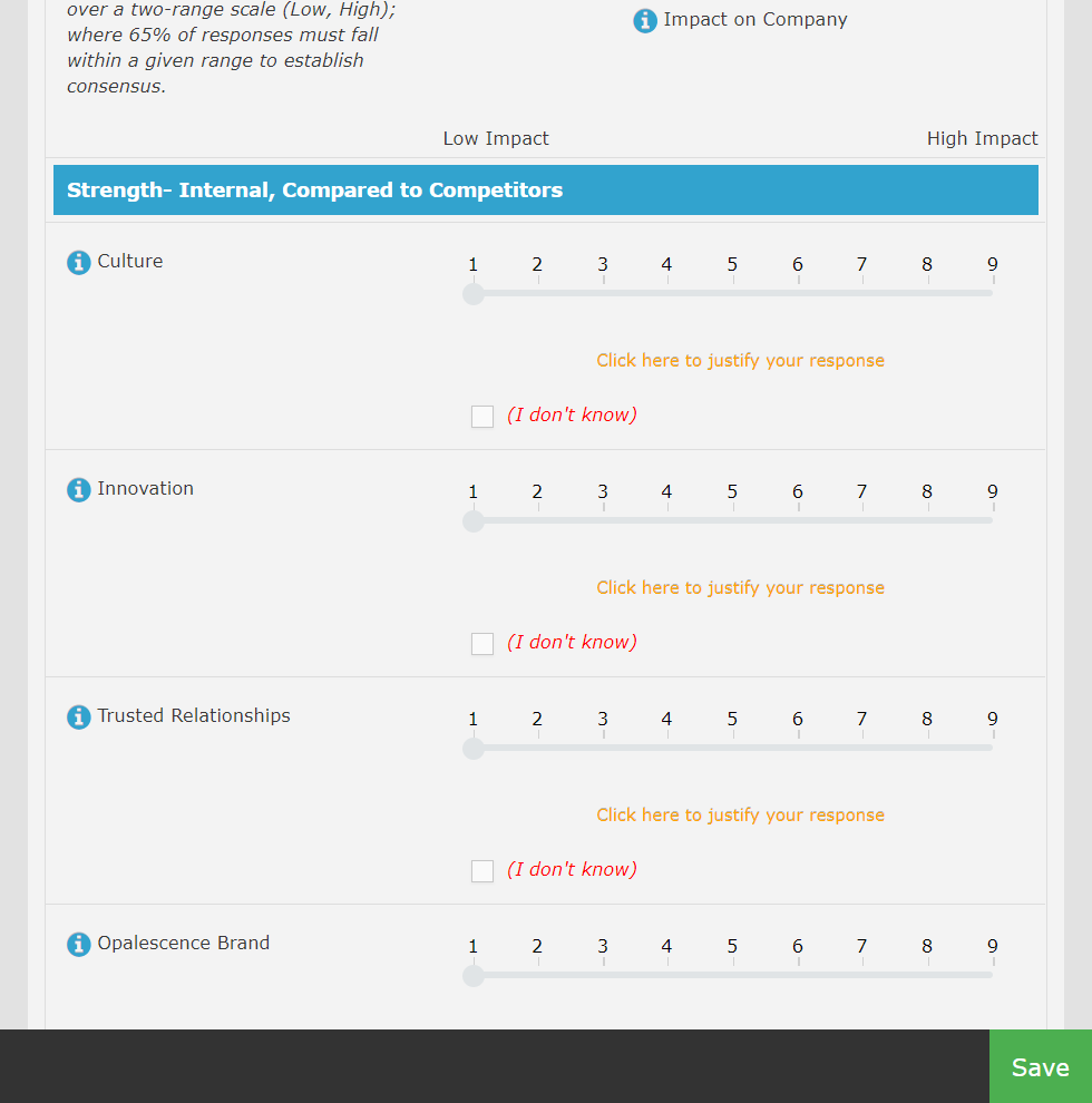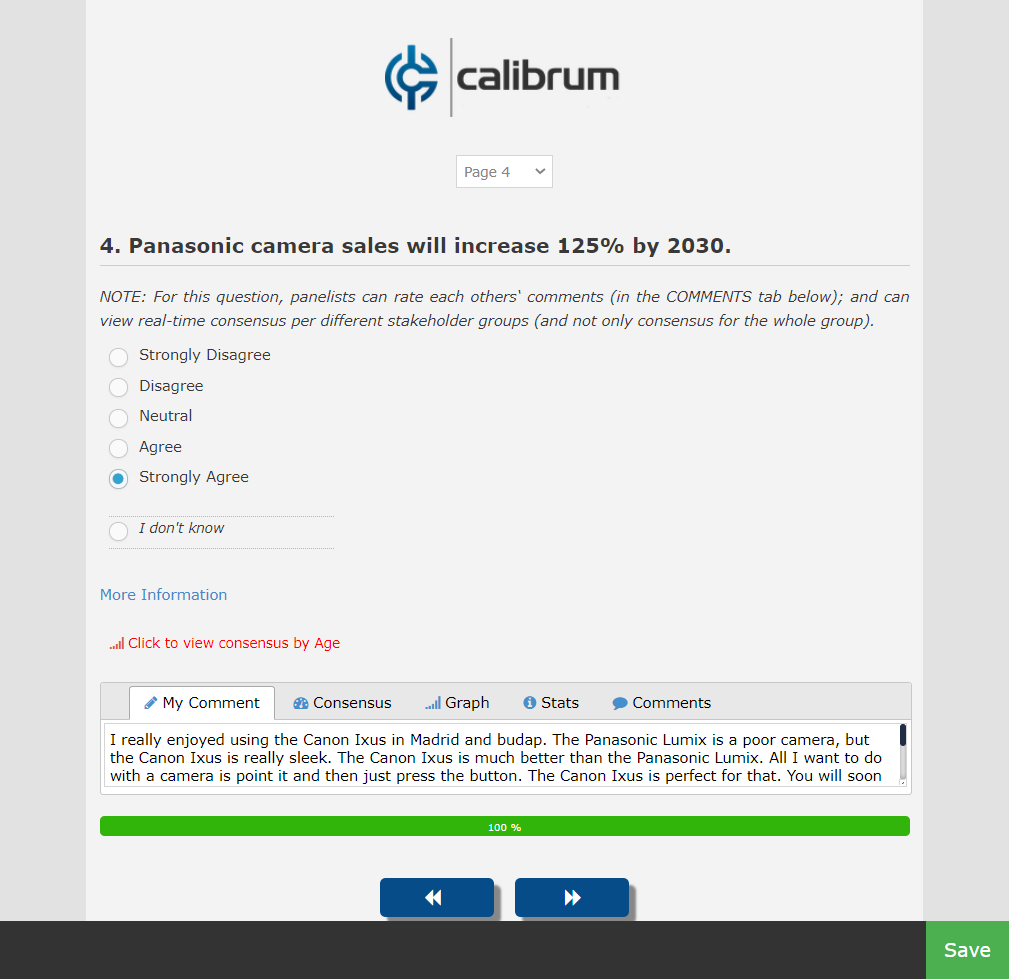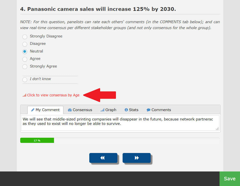 Real-time Delphi: one of the main Delphi methods allowing real-time consensus-building. If your survey is a Real-time Delphi survey, you will be able to see group analytics and feedback right after you saved your answers.