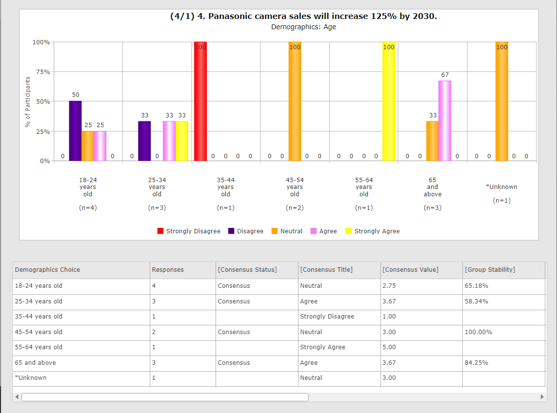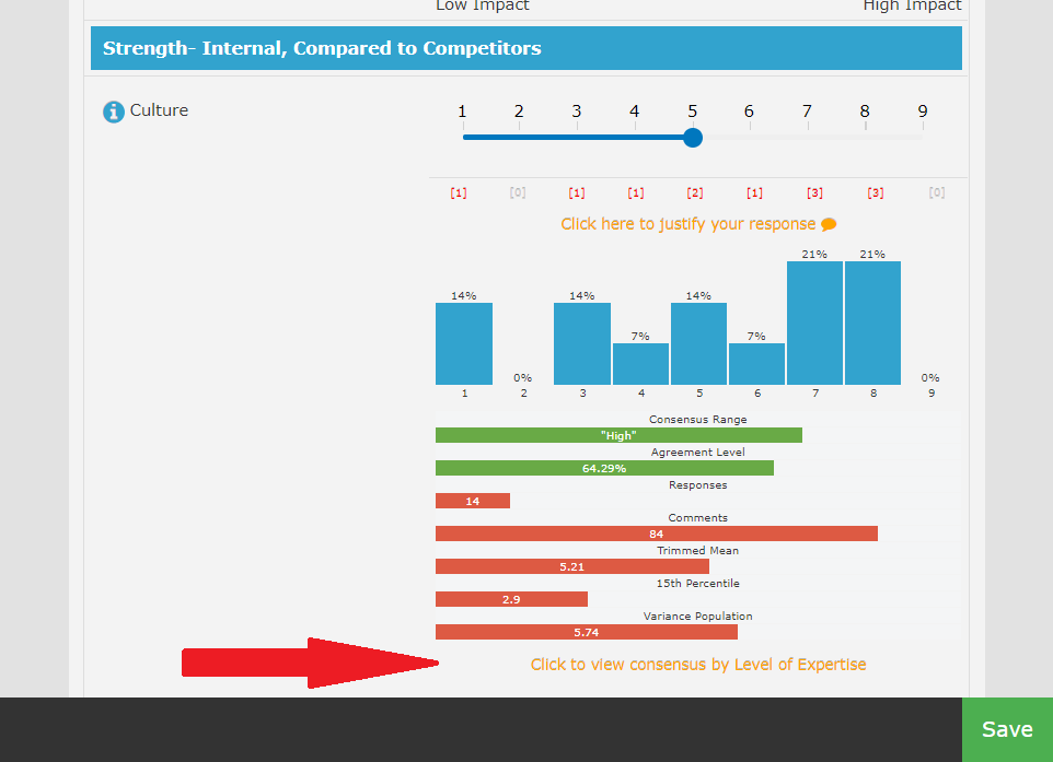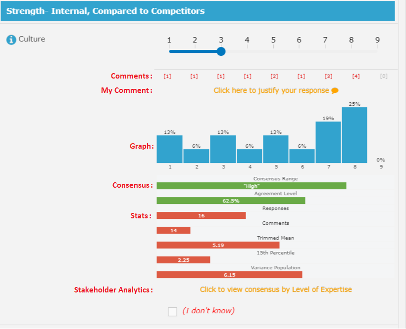 By default, Surveylet will let you see the consensus analysis for the entire survey group, however, in cases you may be interested in seeing the consensus by different demographics groups. Here's where the Stakeholder Analytics comes into place. If enabled by your survey administrator, you will see a "Click to view consensus by..." hyperlink displayed under your choice list.
