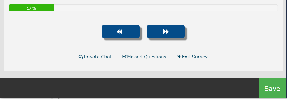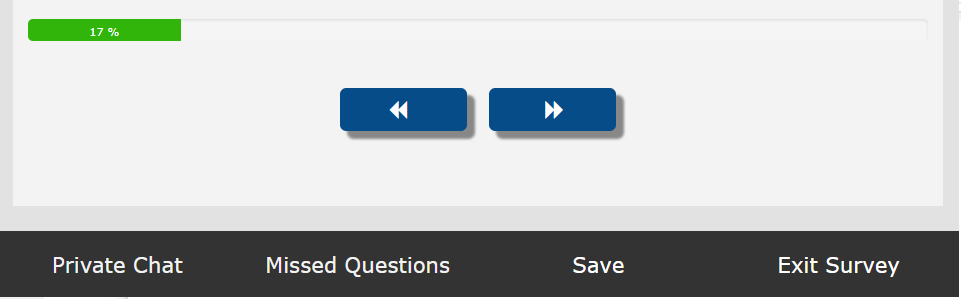 Each survey page contains a footer section at the bottom of the page. The footer has the following sections: progress bar, navigation buttons and footer option buttons. Depending on how your survey administrator has configured the footer, you may see one of the following theme: