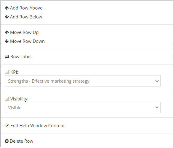 Use the Question Properties window to add/remove matrix rows. You may also use the Matrix Row Properties window to do so same. To access the Matrix Row Properties window, click on the cog icon in front of each matrix row which will display the following menu:.