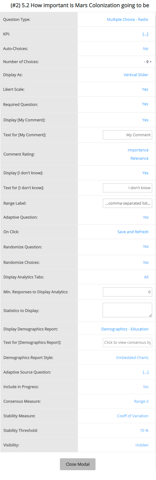 The available list of settings for this question type is shown below. For more information on question settings visit the Question Settings page.