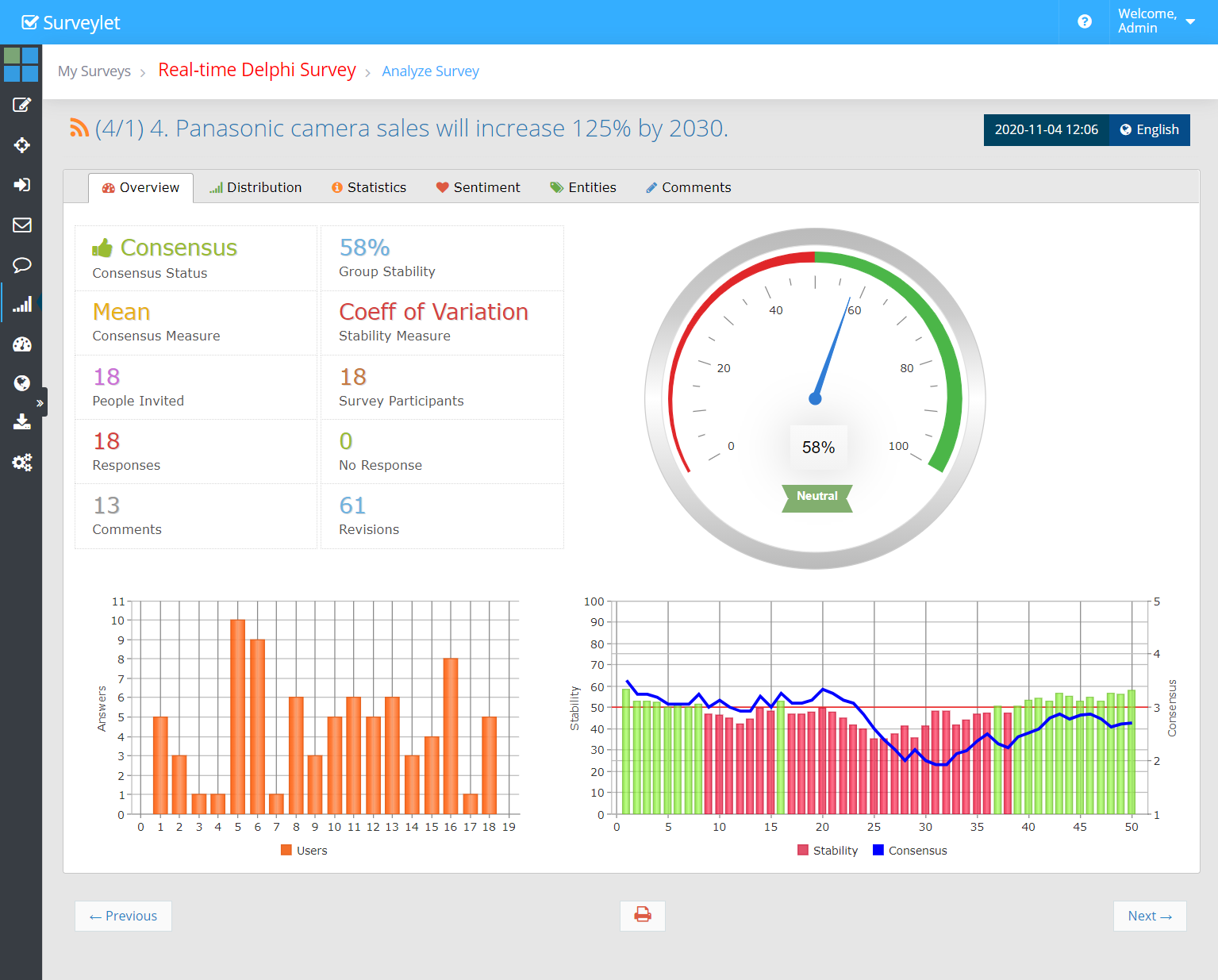 The Overview tab provides you with an overall analysis of the survey, consensus, stability and responses.