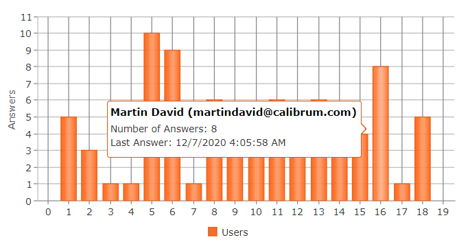 This vertical bar chart represents the responses and revisions made by panelists. Each bar is assigned to a panelists. The height of the bar indicates how many times the respondent answered/revised his/her answer to this question. If the Answer is 1, it means that the panelist answered the question only once and did not revise it afterwards. If for example the Answer is 10 (i.e. the height of the orange bar is at 10, it means that the panelist revised his/her opinion 9 times after s/he answered it). If you hover your mouse over a vertical bar, you will see response details, such as name (email), number of answers, and the date time of the last answer. If the survey's Privacy Settings is set to High, you as the administrator will not be able to see the name (email) of the panelist to hide identity.