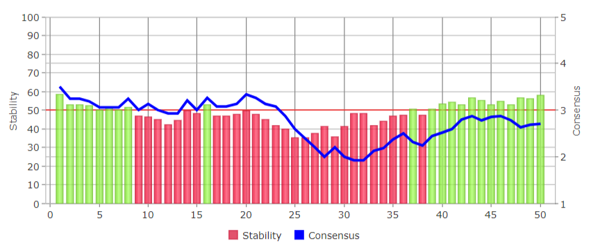 This historical chart displays the evolution of consensus. The blue line is the Consensus line graph (also known as line chart or running chart) displaying Consensus trend. Each green/red bar represents an event in time (either a new responses event, or a revision of existing response event). Events may not be of the same distance from each other in time as these events may happen randomly and not periodically. During a 2 week survey, maybe 80% of responses and revisions are submitted within the last few hours. The red horizontal line across the 50% mark represents the Stability Threshold.