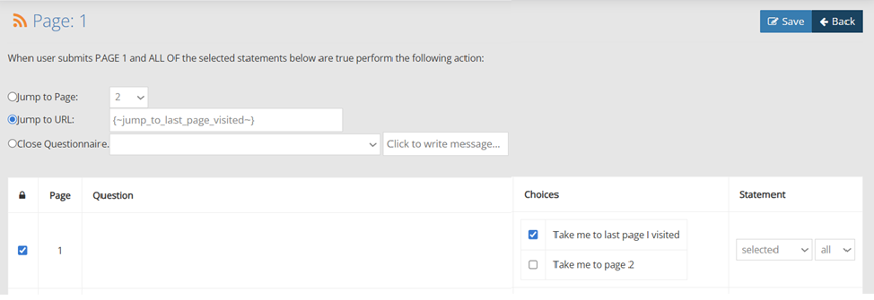 For Page Branching logic on Page 1, you will need to select the required condition and enter the following variable for the "Jump to URL" textbox as shown below: {~jump_to_last_page_visited~}