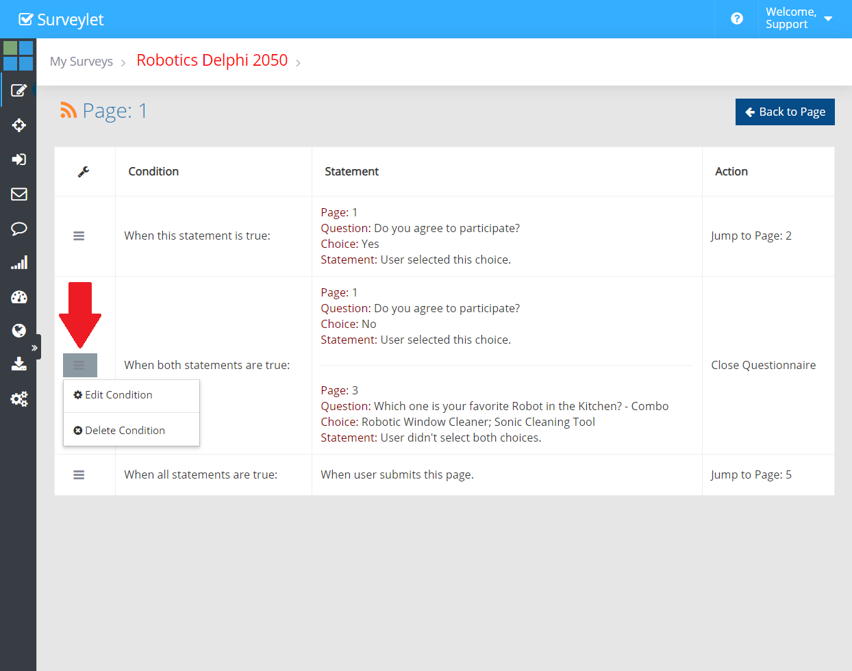 If selected condition is true, panelist is taken to specific survey page. You can jump forward or backward in your survey. If a new page is added after the page branching condition is created, the condition is automatically adjusted. E.g. in your 10 page survey you deleted page 5, then your page branching that took panelists from page 6 to page 8, now will take them from page 5 to page 7.