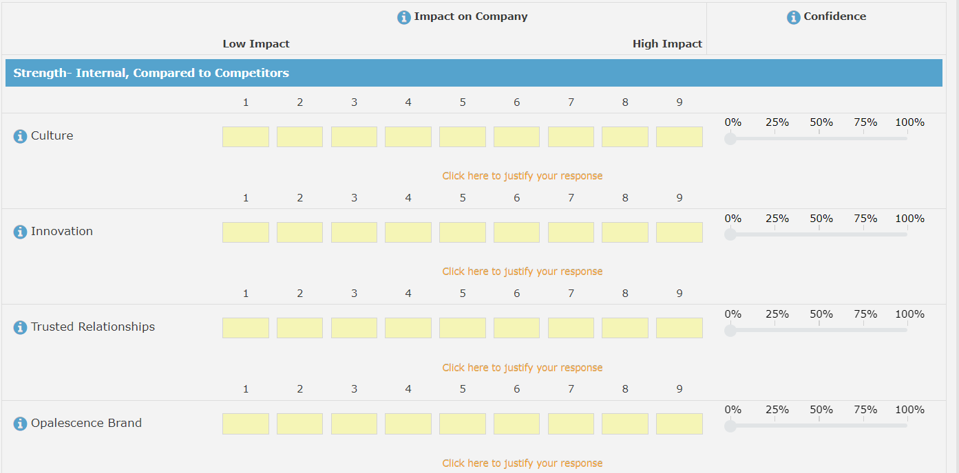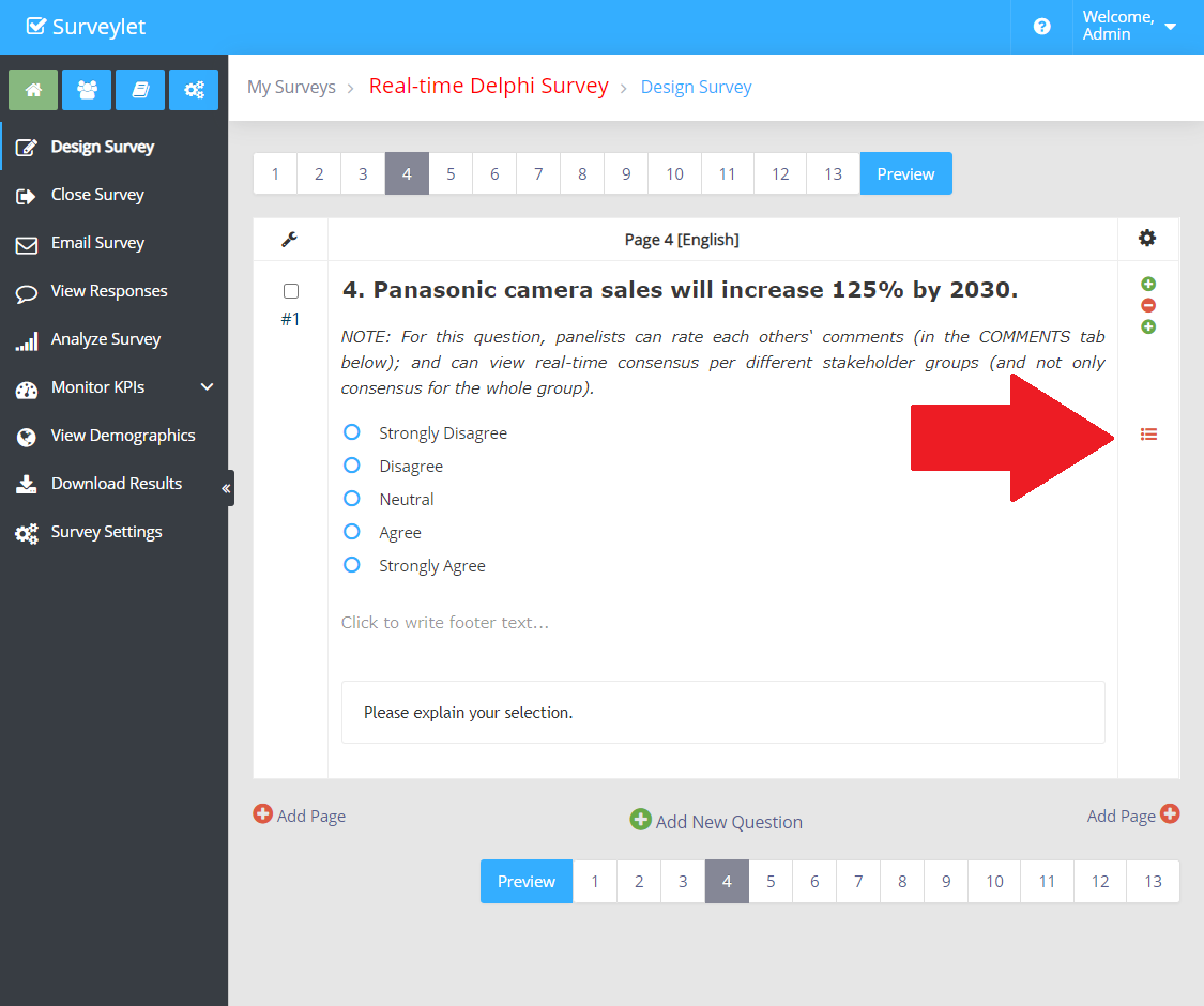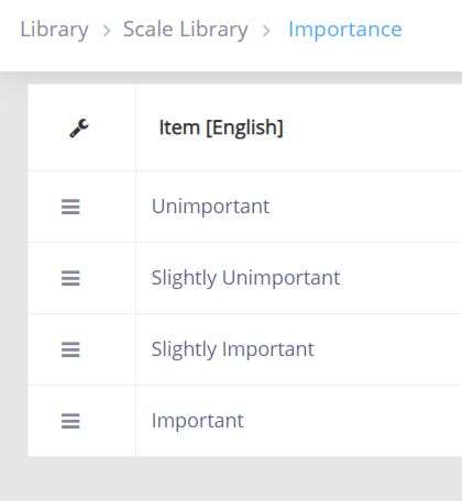 The Importance rating scale is set up with 4 points from negative to positive (which is the standard format in Delphi surveys). You may add as many Likert scale points as you please.