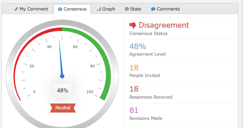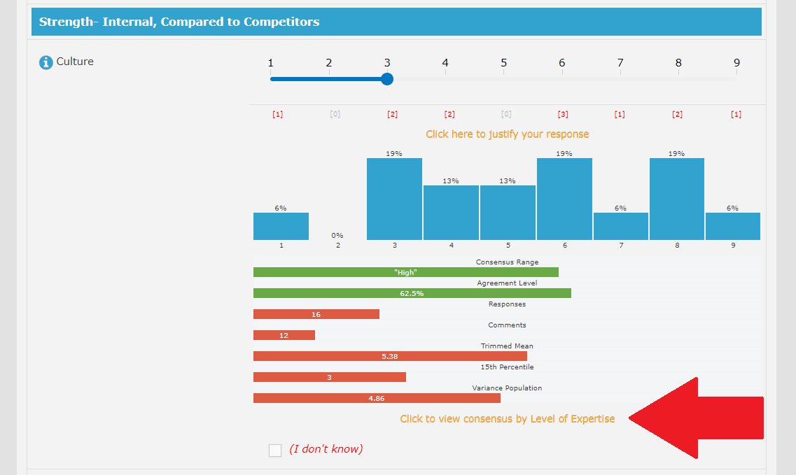 A numerical value from 0-100 that specify the threshold needed for consensus to be established for question. Default is 50%, meaning that if group consensus is greater than 50 there is a consensus (agreement among experts), otherwise there is disagreement. If there is bipolar or multi-polar consensus, it is marked as disagreement.