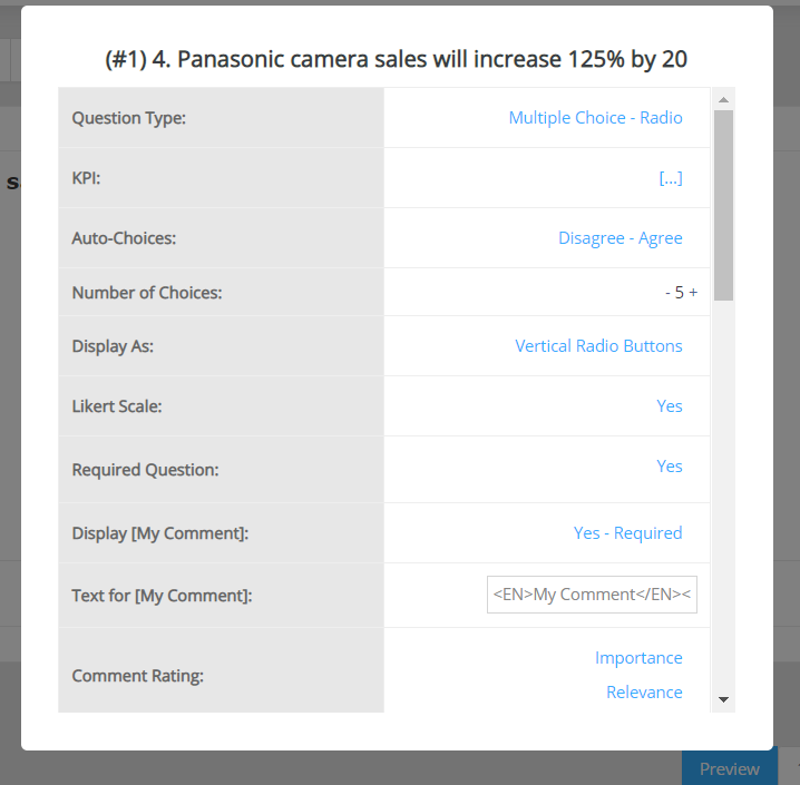 The KPI your question is assigned to. KPI's allow you to group one or more questions together and track their valuation over time and run trend analysis on them such as descriptive, correlation, forecasting, predictive and prescriptive analytics. KPIs you configured are listed here in the KPI dropdown. To configure KPIs, visit the