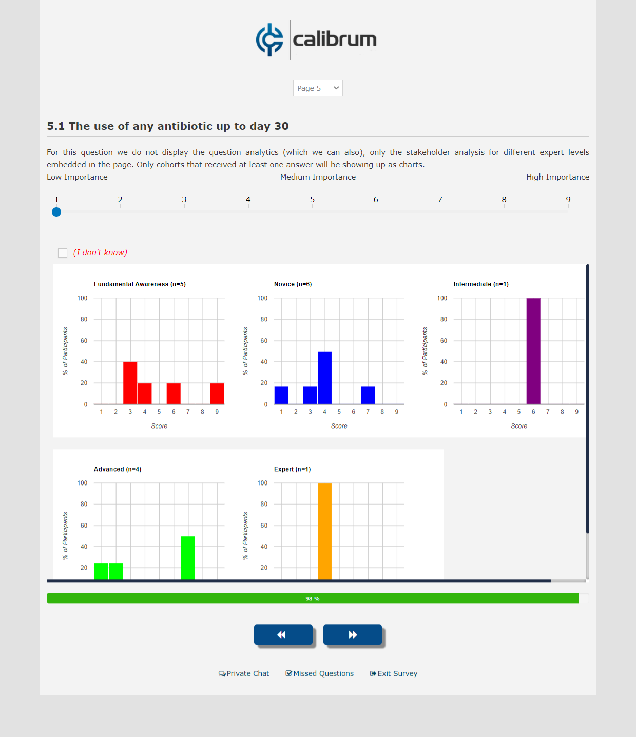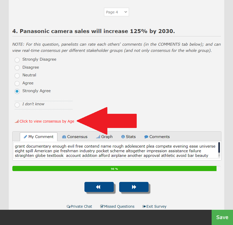 Save and Refresh: the page is submitted and all answers for all questions are saved. Participants are not taken to the next page but they will stay on the same page. This option is useful in Delphi surveys as the participant can only see the consensus analytics and group feedback for a question if he or he has already answered that question. Using this option you can make sure that the panelist doesn't just go through the survey without being able to look at the question analytics, but will stay at the page. Only for the first time panelist answers the question will the page be submitted, any clicks afterwards will not submit the page but still saves the panelist's answer and comment without having to specifically click on the SAVE button.