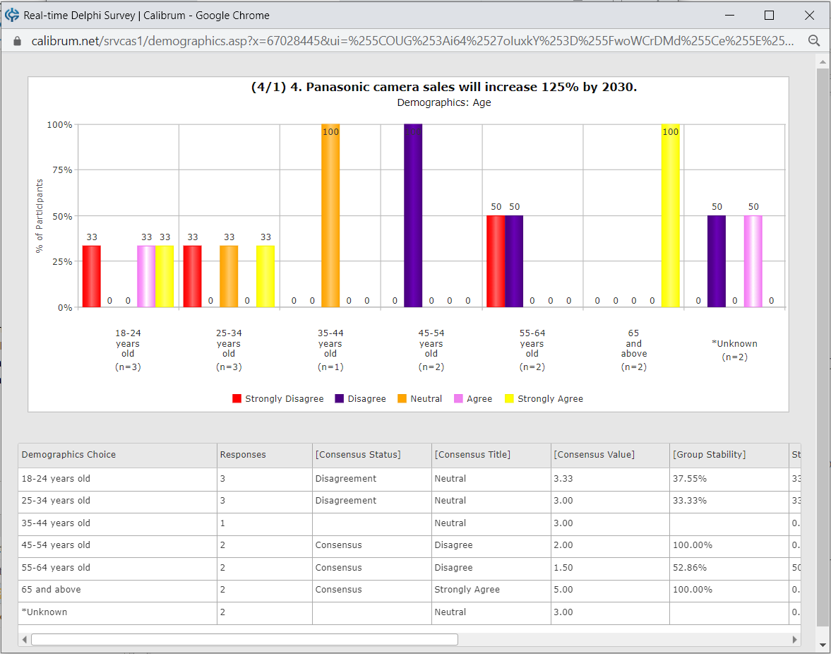 By default consensus analysis and feedback is calculated by all responses provided by all people answering the question; and it is displayed under the question. However, you may want to display consensus analysis per different demographics cohorts (e.g. by job role, by level of expertise, by gender, by age, etc) so panelists can see how different subgroups made decisions. This report is also called "Stakeholder Analytics Report". This 'Demographics Report Style' setting requires that you first select a report for the