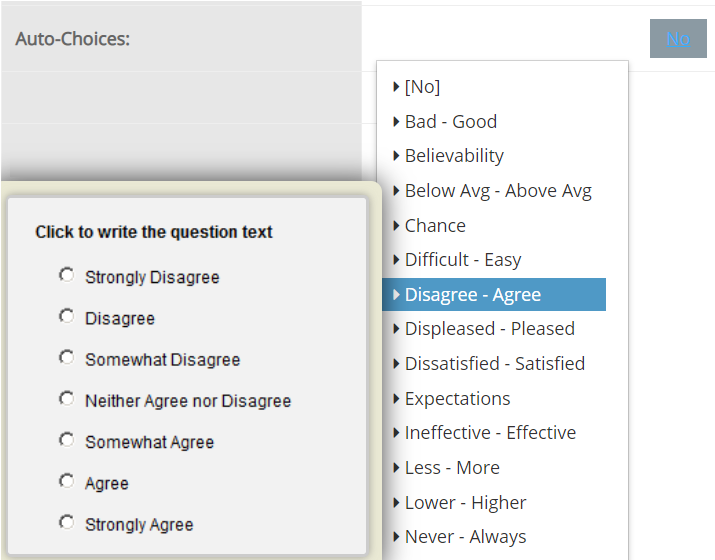 You may automatically populate the choice list for a rating scale question with a list of predefined choices with the help of the Auto-Choices option. This is a useful option for frequently used Likert scale questions. The available choices are organized in different Liker-scale categories as shown below. When Auto-Choice is set, the Likert scale option for the question will also be set to 'Yes'.