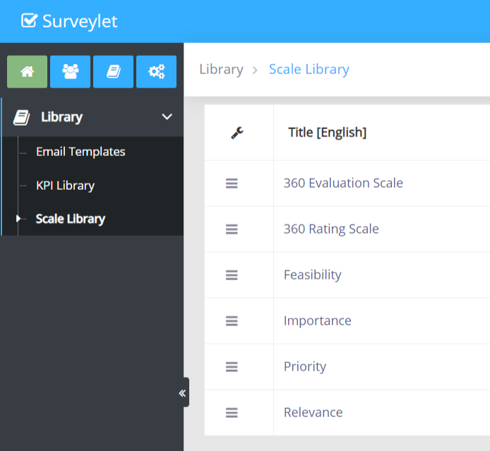 Scale Library. In the following example, there are 4 rating scales set up (Feasibility, Importance, Priority, Relevance). You may add any rating scale with any number of points. Comment rating is not a threaded discussion, panelists can simply rate other panelist's comments through one or two Likert scale s; no direct interaction is allowed between panelists. Comment rating analysis is displayed only to the administrator, panelists cannot see ratings from other panelists. You can assign up to 2 rating scales to each question (or matrix column).