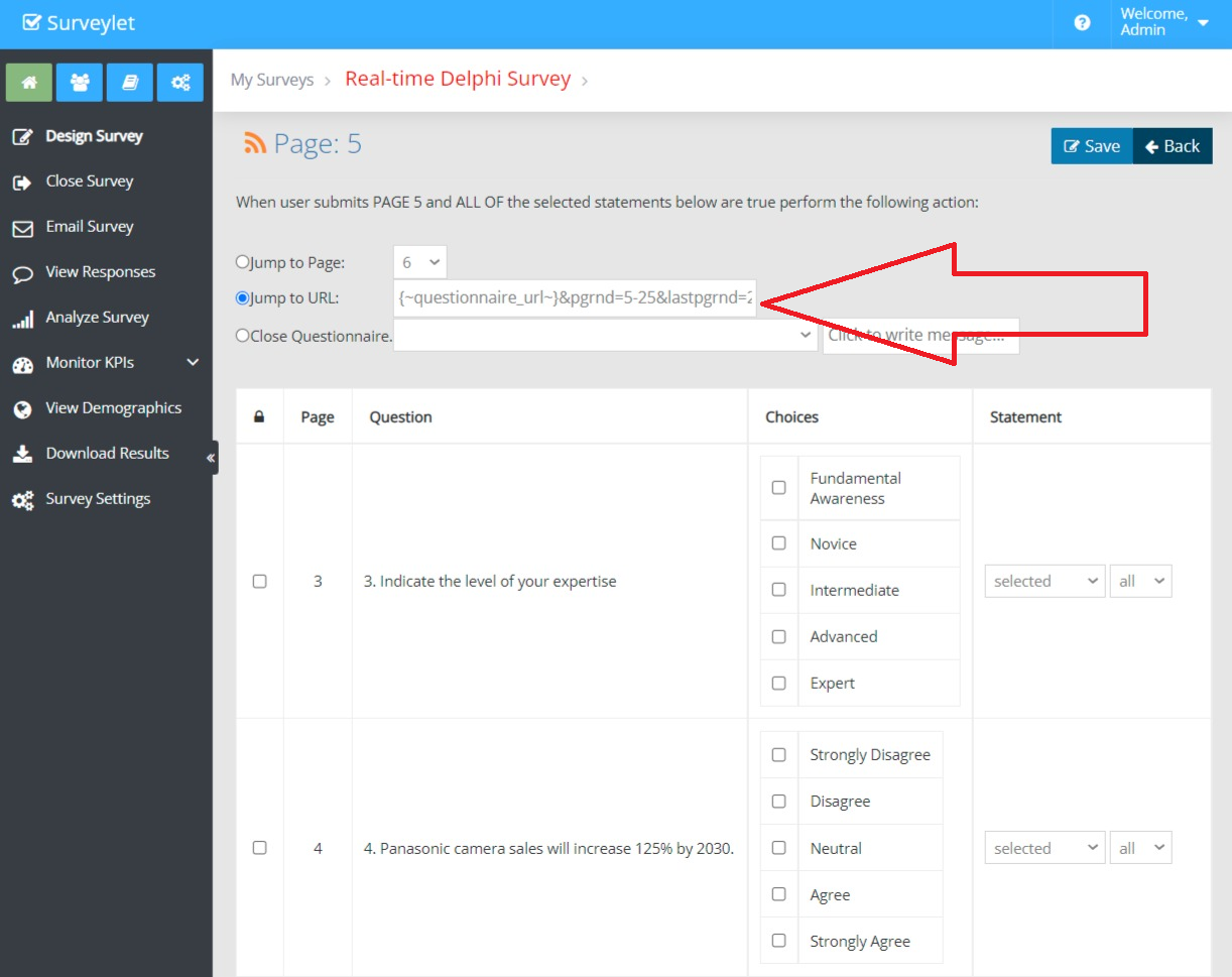 Page range randomization: Surveylet allows you to designate block of pages (page range) where each participant will be taken through randomly (not sequentially). Using the "JUMP TO URL" example below, we add page branching logic to instruct Surveylet to apply page navigation sequence randomization between page 5 and page 25. When they click on the NEXT (>>) button they are randomly taken a page between pages 5-25 that have not yet visited until they have visited all pages. If they then visited all pages between page 5 and page 25, then they are taken to the final landing page, i.e. last page (lastpgrnd). We must add the same page branching logic for all pages starting from page 5 through page 25 exactly as shown below. Page 26 will not need the randomization logic as it is the final landing page. You may set up multiple page rage randomization in your survey, where each page range can be randomized individually using the syntax provided in the example below: