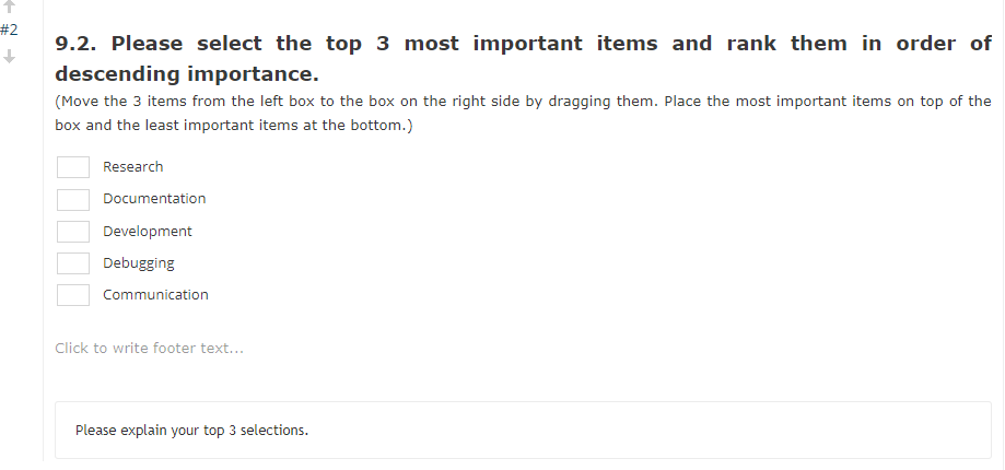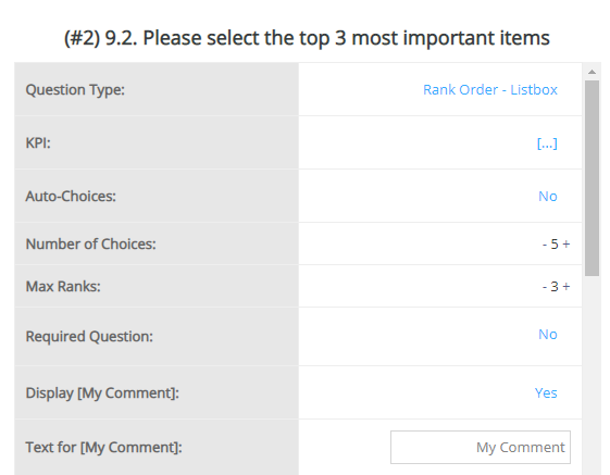 The available list of settings for this question type is shown below. For more information on question settings visit the