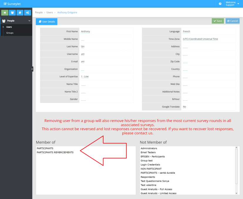 To remove a user from a survey group (and therefore from all surveys this survey group is assigned to), go to the Users page and edit the selected user and delete the group that you want to delete him from and then click on SAVE as shown below. His/her responses will be deleted from all survey rounds in all affected surveys.