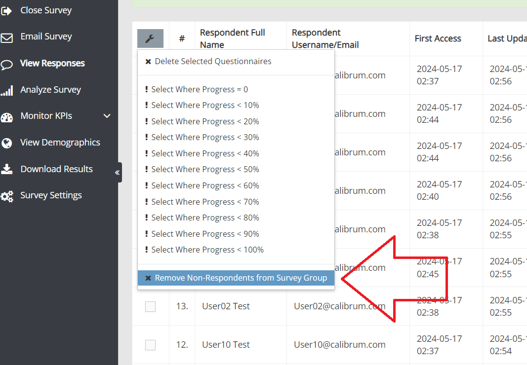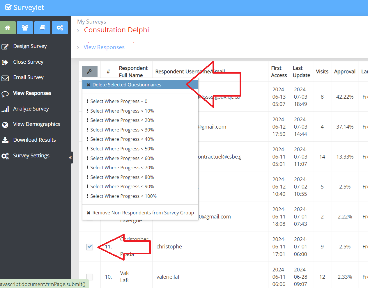 Or, if you want to delete current responses but keep this panelist in the survey, you can just go to View Responses, and select that person and click on the wrench icon and select DELETE SELECTED QUESTIONNAIRES (it will just delete his/her response in the given survey). You can remove multiple panelists using this approach. Panelists with deleted questionnaires will still be able to return and access the survey unless you remove them from the survey participants group.