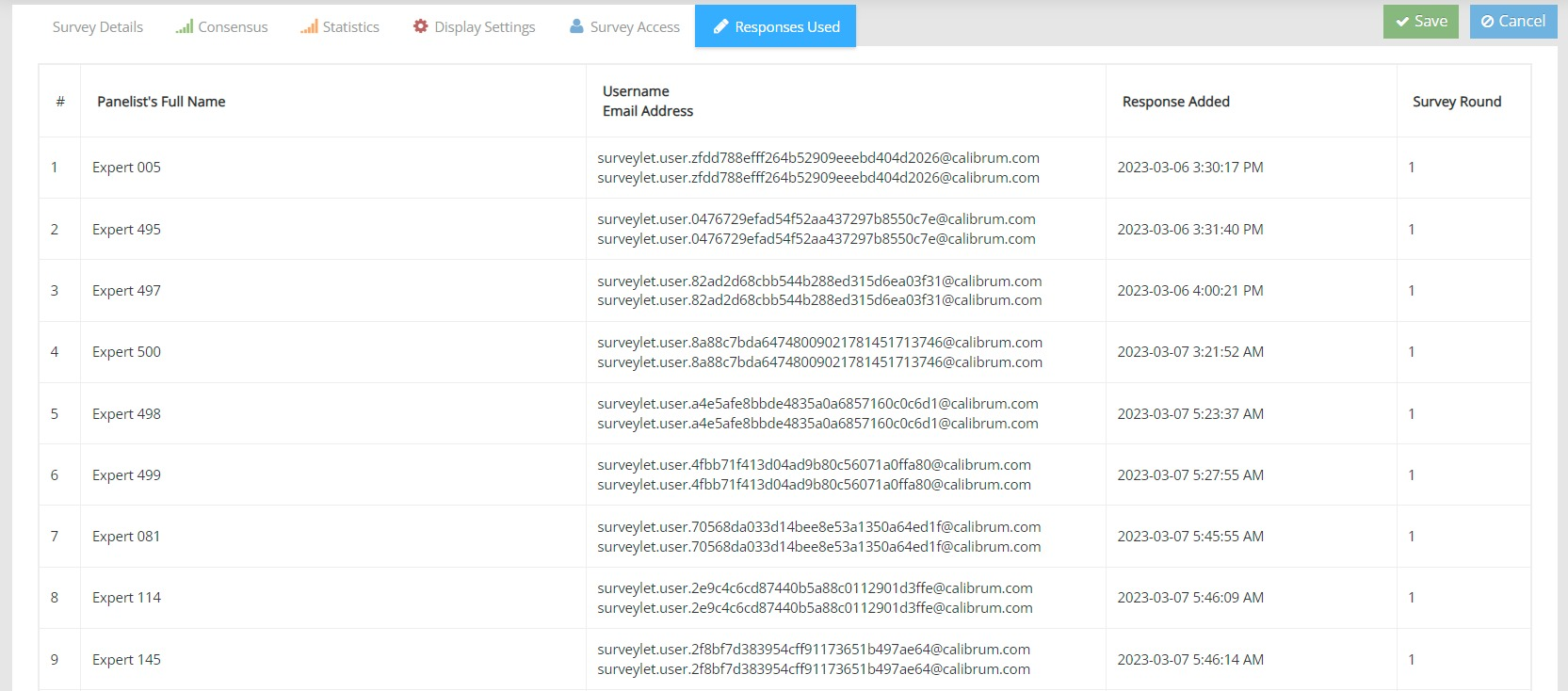 This page displays the log of all responses used, even if the response was already deleted by the survey admin. The Username/Email Address column shows both the username and email address of the panelist, which may be the same. Once a response has been used, it will show up on this page and cannot be removed. For High Privacy surveys, the user information is blanked out and not shown.