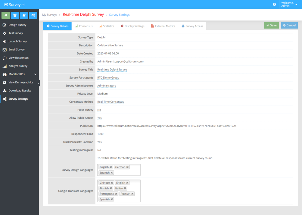 Survey Privacy. An important part of Delphi projects. Depending on who can identify whom in a survey, there are 3 different privacy level available in Surveylet: Low, Medium and High. In a survey with Low Privacy, both survey administrators and survey panelists can identify everyone (name, email). In Medium privacy, only survey administrators can identify survey panelists, but survey panelists cannot identify other survey panelists. High Privacy, nor the survey administrators, nor the survey panelists can identify anyone in the survey. Be careful, if it is set to Low, every panelist can see the ID of other respondents. Once the privacy settings is set and there is at least one responses received in the survey, the privacy setting cannot be changed; to change it, survey administrator will need to delete all responses first.