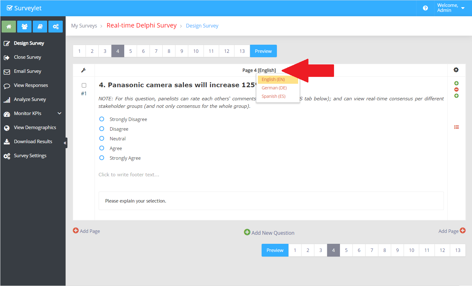 Language help page. You can add a language at any time. When you delete an existing language, the language translation for all questions will also be removed and cannot be restored later by re-adding the language. The Survey Design Languages listed here do not need to be added to Google Translate Languages list, meaning that you can design a language in English only and display it in Italian and Chinese. In the Survey designer, the languages listed in the "Survey Design Languages" will be available for selection from the language dropdown as shown below:
