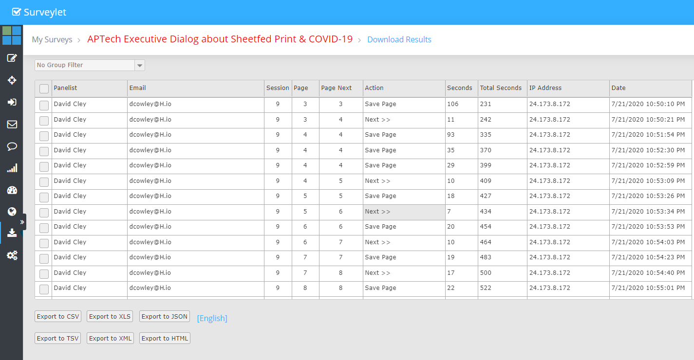 The page navigation report displays user navigation journey page by page and time spent on each page. It explains if user clicked on Next or Back buttons or Saved the page or jumped forward using the question selector. It also provides information on the number of times the panelist entered the survey ("Session") and the IP Address the user accessed the survey from. Depending on the survey's privacy level, the IP Address may not be collected or displayed.