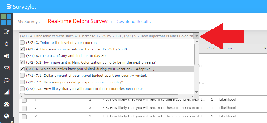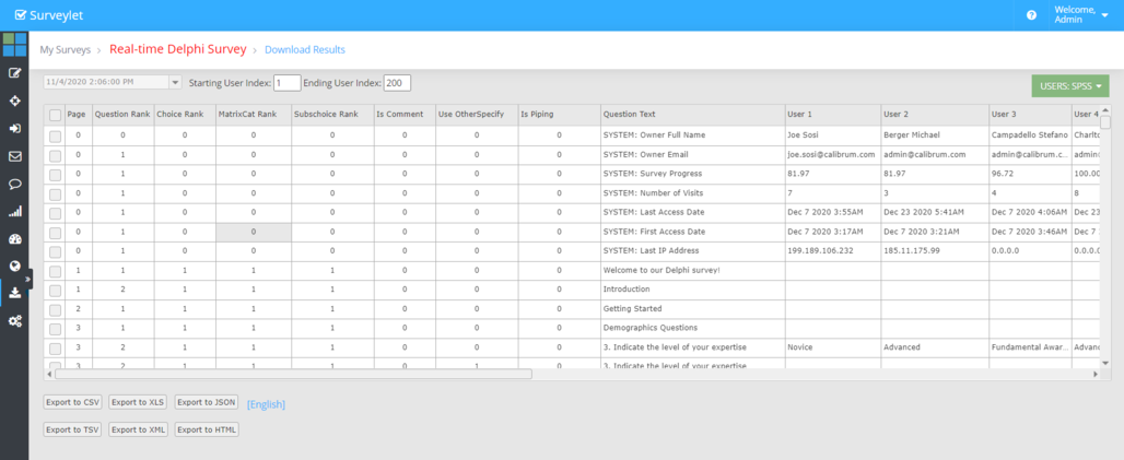 Display of SPSS data for selected survey round. In the SPSS report, the questions are listed on rows and panelists on columns.